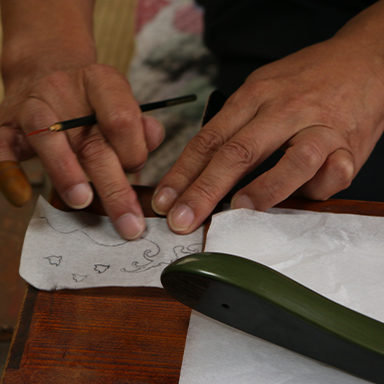 After the topcoat is applied, the next step is the decoration known as Maki-e. Maki-e is a technique in which gold, silver, or colored metallic powder is sprinkled on the surface of the lacquerware, and delicate patterns or designs are drawn with a fine brush.