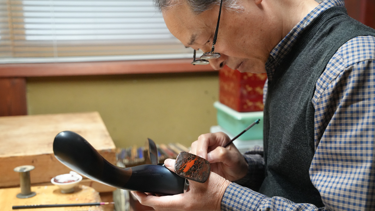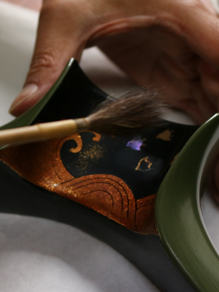 蒔絵は、漆の表面に金や銀の粉、色粉を蒔き、筆で模様や絵柄を描き出す伝統技法です。 職人は下書きから手作業で描き、一つひとつの細かなデザインを丁寧に仕上げていきます。