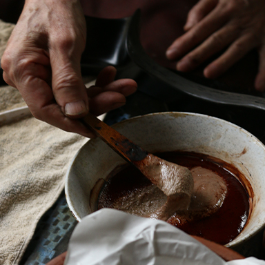 一般的な漆器では、漆と砥石の粉や砂などを混ぜて使いますが、輪島塗では焼いた珪藻土を使うのが特徴です。 米糊と漆に地の粉を加えることで、下地の耐久性が大きく向上します。 この貴重な地の粉を生漆に混ぜ、下地塗りを行うことで、輪島塗の高い耐久性が実現されているのです。