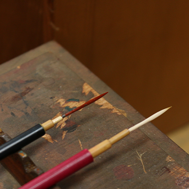After the topcoat is applied, the next step is the decoration known as Maki-e. Maki-e is a technique in which gold, silver, or colored metallic powder is sprinkled on the surface of the lacquerware, and delicate patterns or designs are drawn with a fine brush.