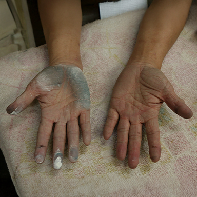 The Wajima-nuri process is subdivided into different processes, and the process of roiro is one of the most important finishing and polishing steps. To achieve a mirror-like reflection, the polishing process alone consists of 6 steps. The final step involves rubbing with fingertips and polishing powder.This delicate process is easily damaged by dry fingers, so it requires the right balance of oil on the hands. The craftsman must carefully protect their hands to ensure the process is executed flawlessly.