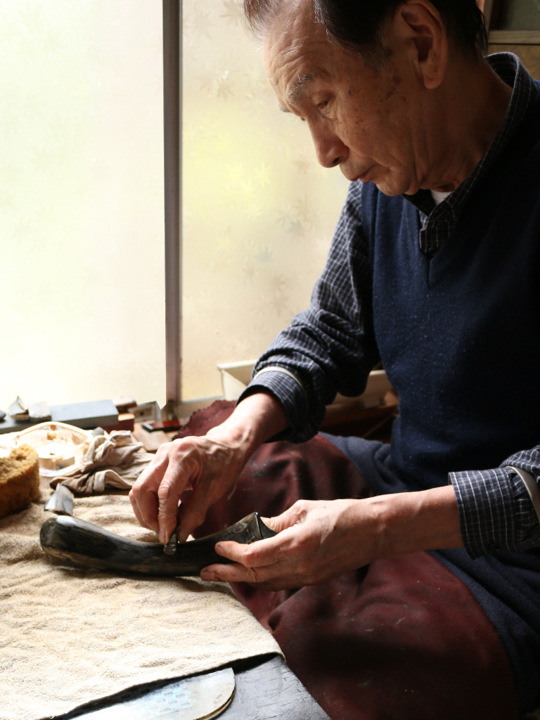 In Wajima, the processes of ‘undercoating’, ‘overcoating’, ‘roiro (black lacquer)’ and ‘Maki-e (Gold and silver lacquer)’ are carried out by skilled craftsmen. Many craftsmen have workshops in their own homes. It is said to be rare to find an entire town with such a high concentration of skilled artisans, leading to the saying: 'Ask anyone in Wajima, and you will find the answer'. These processes are organised by ‘Nushiya’, which is exactly what Mr.Okagaki is. They play the role of producers, taking care of everything from planning to production and sales of lacquerware. The division of labour in Wajima has been a traditional way of making lacquerware since the Edo period, ensures that the baton is passed seamlessly from one craftsman to another.