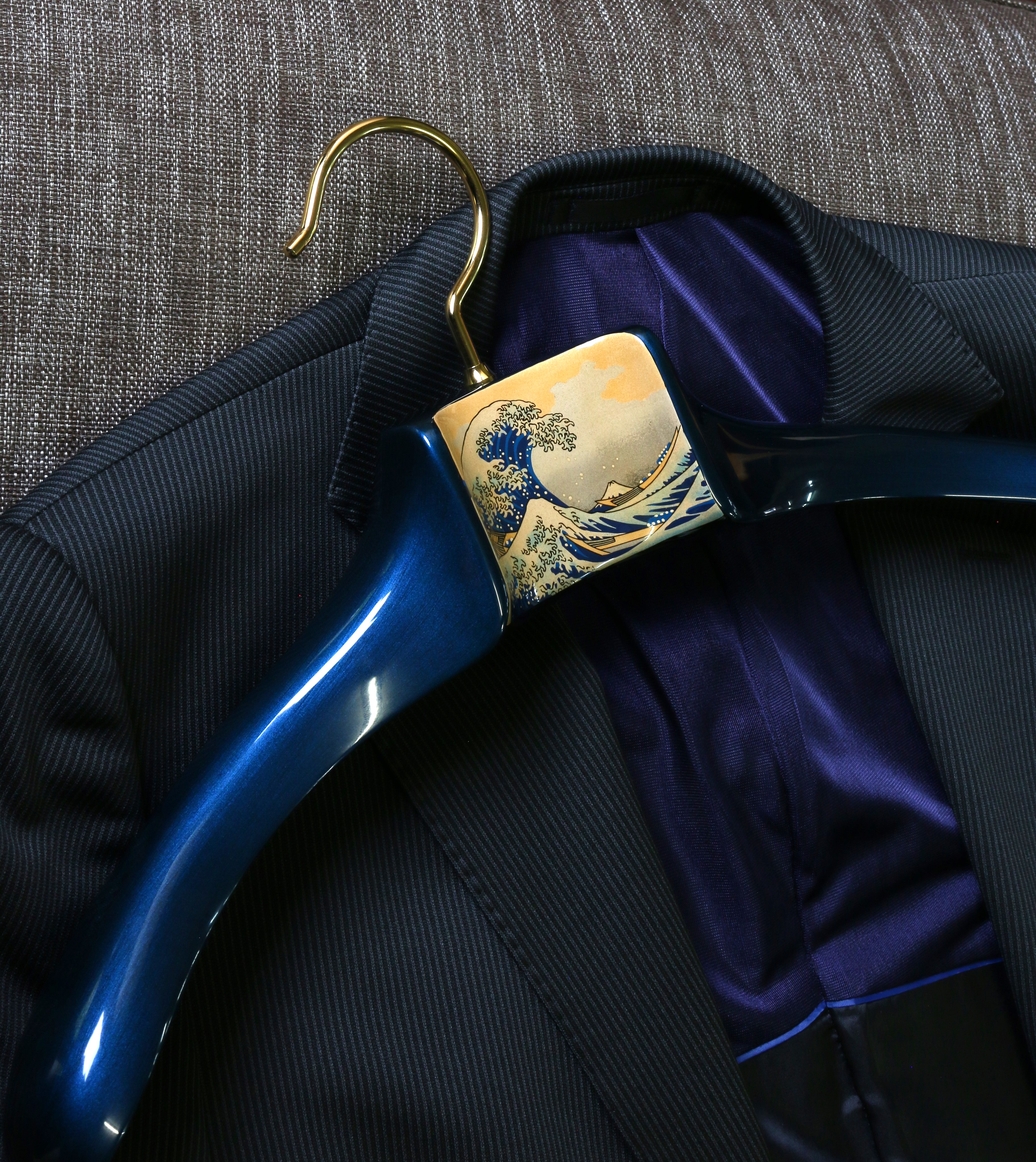 In addition to the traditional lacquer colors of black and vermilion, Wajima lacquer hangers also feature a shiny, bright blue lacquer known as 'pearl lacquer.' This choice reflects Mr. Okagaki's desire to encourage people to incorporate lacquerware into their daily lives.