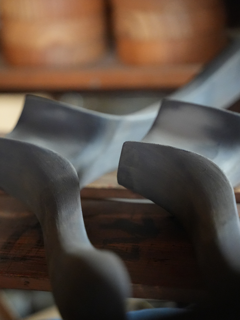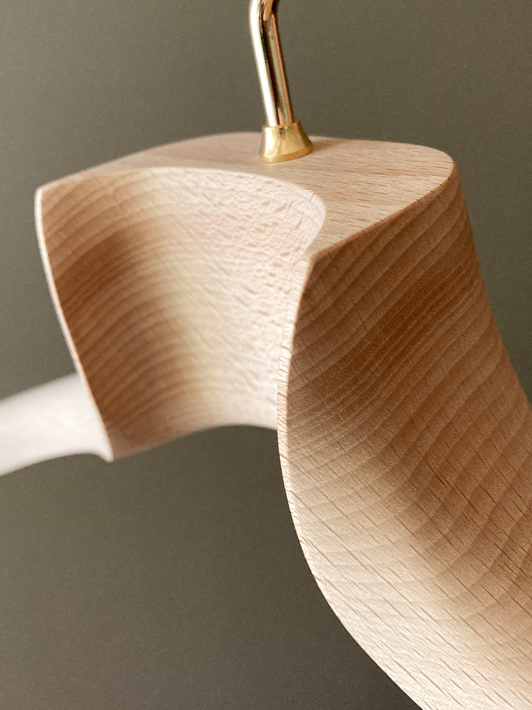 The wooden part is initially hand-carved at the NAKATA HANGER factory in Toyooka, Hyogo Prefecture. Wooden parts are carved out from a single wood plank using a Nenkin kanna, and carefully finished into a unique shape by carefully assessing the wood grain flow. These special hanger can only be produced by one craftsman at the only wooden hanger manufacturer in Japan.