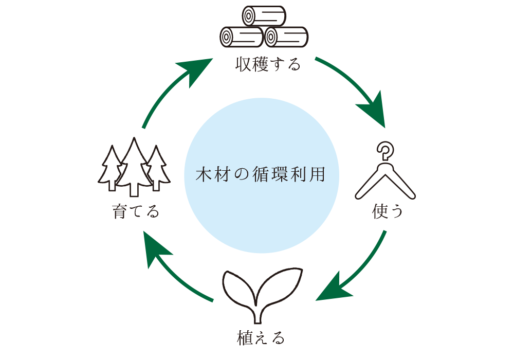 本来、木材はとてもサステナブルな資源です。持続可能性のポイントは「森林資源の循環利用」という考え方。現在の林業や森林保全においても最も重要な仕組です。「森林資源の循環利用」とは木を植える→育てる→収穫する→使う→新たに植えるというサイクルのことです。この仕組みにより、木材は産出し続けることができる資源となるのです。循環利用サイクルの仕組による森林管理のメリットは以下の通り。