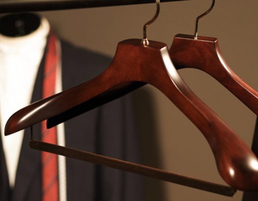 トレンチ形状(首周りの凹凸があるデザイン)は洋服の襟元のストレスを軽減するデザインです。ハンガーの首周りにジャケットの襟が沿う場面が切り取られたこの写真は、洋服のことを考えて生産しているハンガーメーカー冥利に尽きる一枚です。ハンガーの立体感も表現された素敵な写真です。