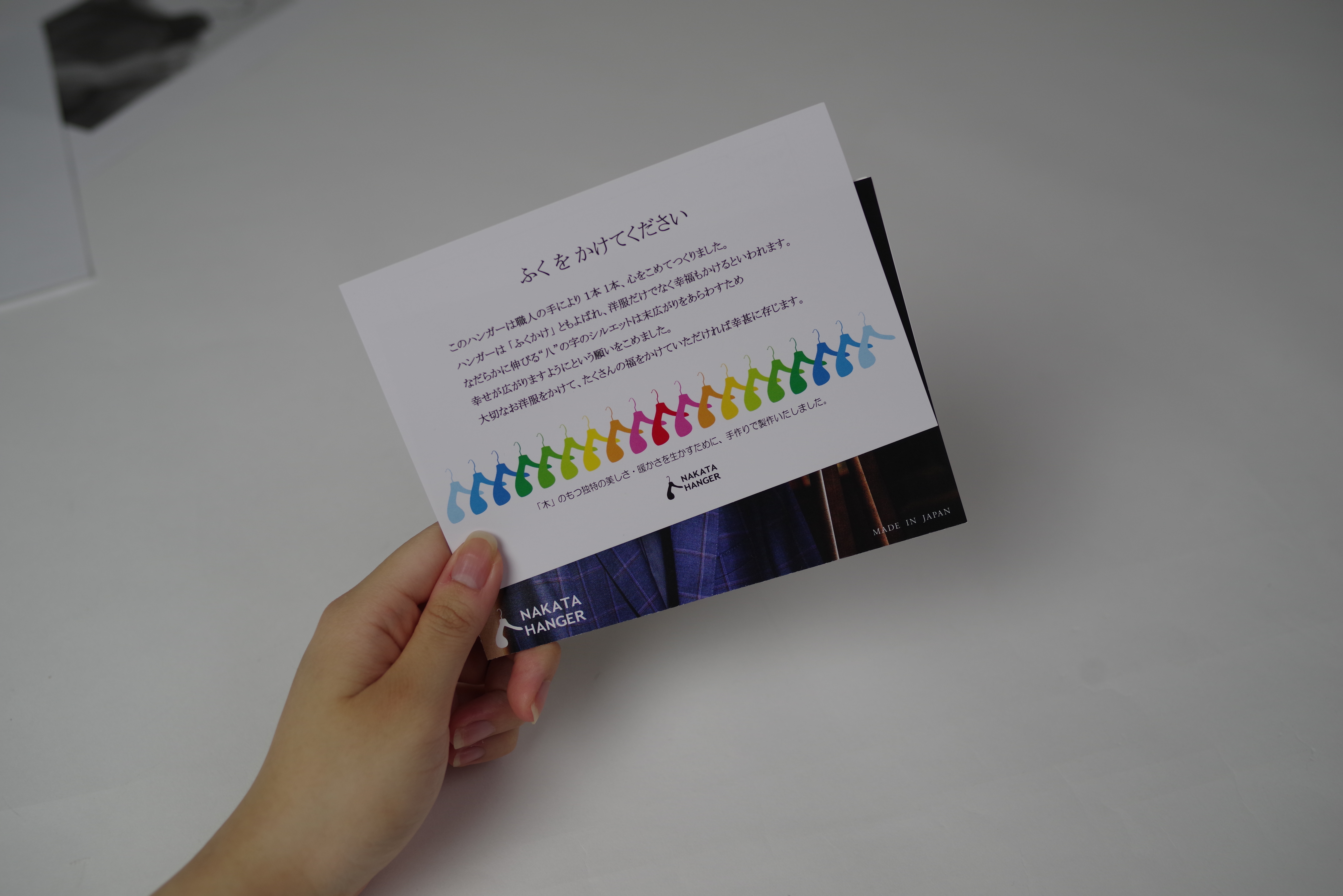 NAKATA HANGER には「ふく(服)をかける=福をかける」という願いが込められています。 また、ハンガーの「八」の形は末広がりを象徴し、幸せと繁栄を祈る縁起の良いデザインです。