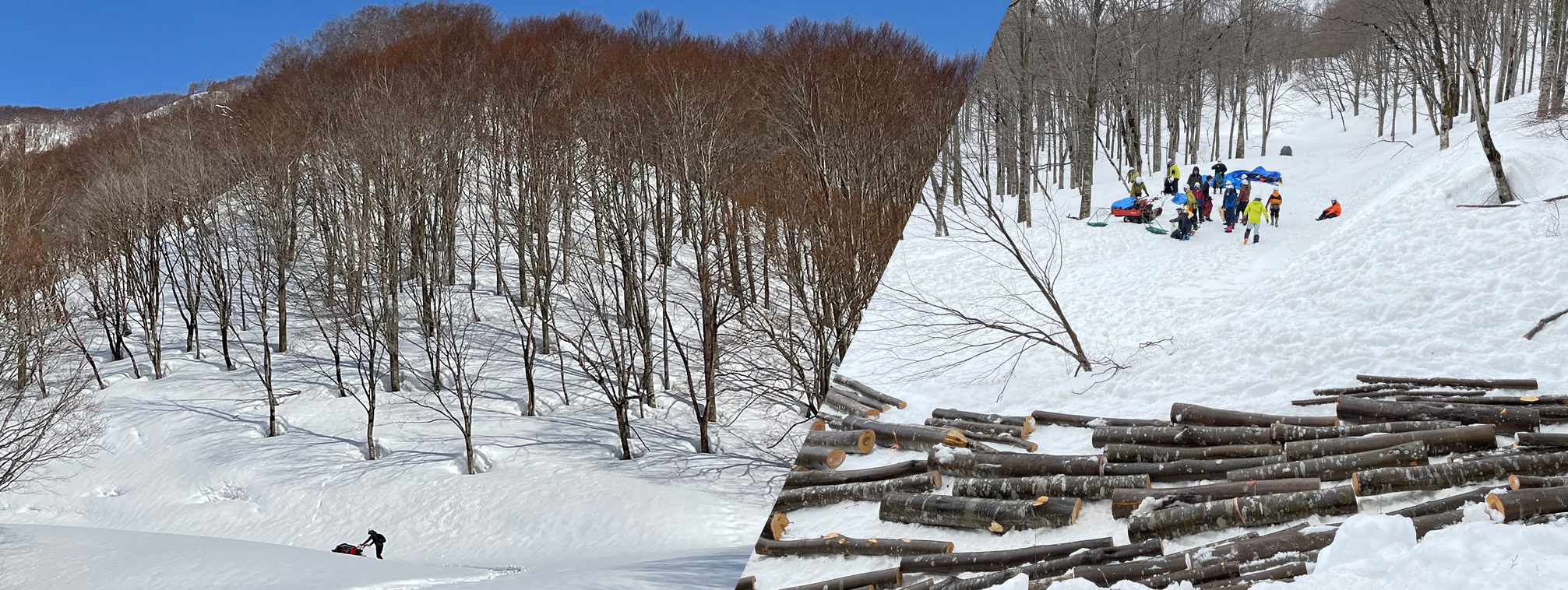 2022/3/25(金) に、大白川集落のブナ林で行われる間伐と人力による集材のボランティアに参加しました。3m以上積もった雪深い山肌に力強くまっすぐと伸びたブナ林は、非常に美しいものでした。天候も良く、約40人のボランティアの方々と共に間伐されたブナ材の丸太を人力で運び出しました。丸太は雪上を滑らせて下ろしますので、雪が残っているこの間しか人力での運び出しはできません。いつもは板材の状態でしか見ることのない生のブナ材の丸太は想像以上に重いので、非常に体力を使う作業です。しかし、このように定期的に間伐することで良質なブナ材を持続的に育てることが可能となるのです。スノービーチに関わる様々な人たちと交流したことで、スノービーチの意義やその土地の人達の想いをしっかりと確認でき、有意義な経験となりました。