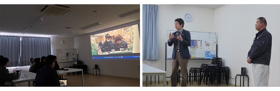 さらに、「一本物ハンガー」を手掛ける当社の成型職人・田中が出演する映画を参加者の皆さんで鑑賞しました。上映後の対話では、「今後の目標」についての質問も挙がり、田中からは、「自身の名を冠したオリジナルモデルを形にしたい」という志が語られました。